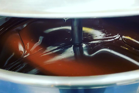 Cacao nibs, now isolated from their husks, are ground into a smooth texture called cacao mass using a melanger. This thick paste consists of cacao solids and cacao butter—both of which are present, generally in equal proportion, within cacao nibs. Cacao nibs transform into paste with surprising speed, yet the entire process of turning solid into liquid takes multiple days. To fully break down cacao nibs into imperceptible particles, a melanger crushes material between two large wheels. Heat and friction over time reduces solid bits of cacao into tiny particles and releases fat within the plant, resulting in creamy, decadent chocolate.
