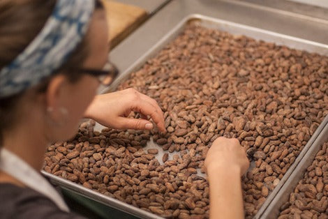 We carefully sort each lot of cacao beans by hand. This ensures that every batch of chocolate is free from impurities such as small debris, imperfect beans, and other occasional oddities. Since we source from small farms where people live and work instead of large industrial factories, it is common to find human evidence among our cacao beans. These unharmful bits are easy to remove, and they prove to us that we are receiving our ingredients from vibrant, lively communities. Sorting cacao beans by hand is a slow, painstaking process; it sets our chocolate apart, and it assures that every delicious bite comes straight from the best cacao possible.