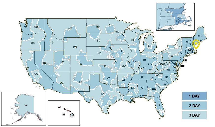 All orders are shipped from Chequessett Chocolate at 8 Highland Road, North Truro, MA. Below is a map showing postal zones and delivery time estimates. Recipients in Massachusetts and Rhode Island can expect 1-day delivery, and all other delivery will be 2-day or 3-day depending on the location.